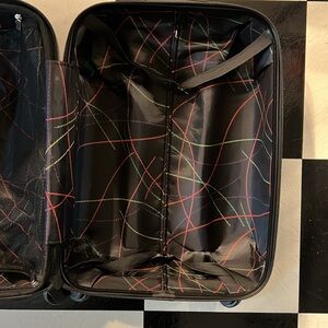 Vibrant suitcase featuring colorful embroidery on a sleek black background. Perfect for stylish travel.