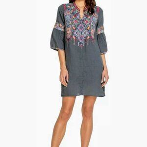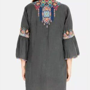 Vibrant embroidered top with intricate patterns. Features red, blue, and yellow designs.