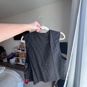Vintage vibrant vest with intricate embroidery. Features a mix of colors for a bold look. Can be buckled in front.