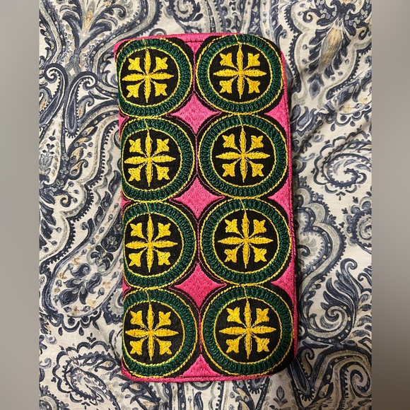 Vibrant wallet with intricate embroidery. Features pink, yellow, and green colors. Artisan made! Bought in India but never used. Comes with zipper coin pouch area and fits bills too.