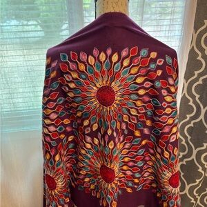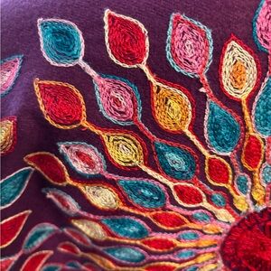 Vibrant and intricate embroidery. Features red, blue, and orange patterns.