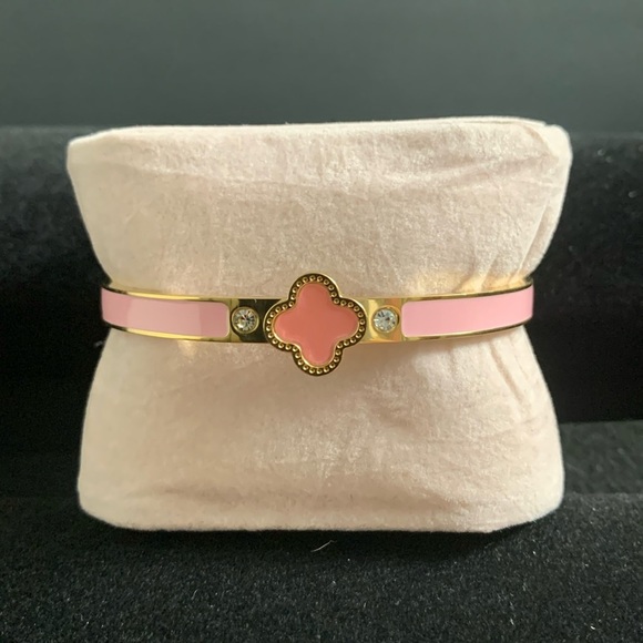 enamel bracelets in orange, pink, and green. Features gold accents and clover design. New. Stainless steel.