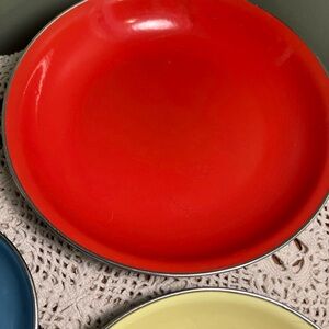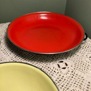 Vibrant enamel cookware set featuring red, blue, and yellow dishes. Includes a black serving utensil.