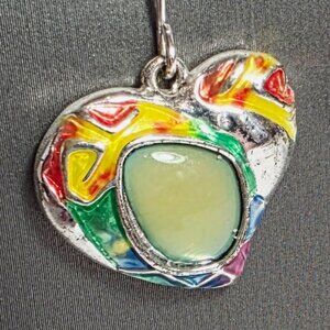 Fun and vibrant heart earrings with rainbow enamel accents and a green center cabachon. Silver-tone finish with lightweight hooks — perfect for adding a pop of color to any outfit.