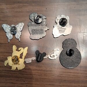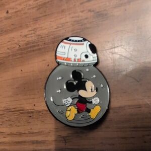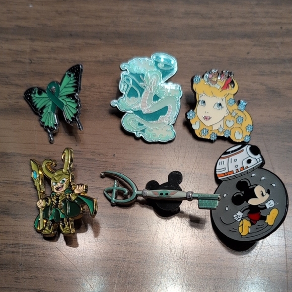 Set of six colorful enamel pins featuring various designs. Perfect for adding flair to jackets or bags. Featured characters of Mickey Mouse, BB-8, Cinderella, Grogu, Loki, and Haku.