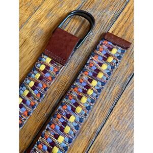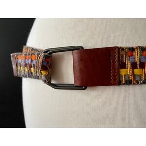 Colorful Fabric Belt w/Leather Trim Womens size S. Featuring a multicolored weave fabric strap, brown leather trim and a double D-ring buckle.