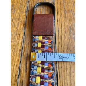 Colorful Fabric Belt w/Leather Trim Womens size S. Featuring a multicolored weave fabric strap, brown leather trim and a double D-ring buckle.