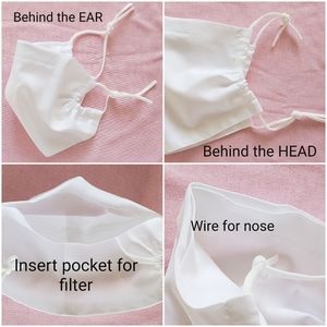 This Face Mask includes an insert pocket for a filter and a nose wire. It can be worn behind the HEAD or EARS...you can wear it either way. It comes with a generous amount of 3mm elastic. The elastic ties are comfortable and adjustable. Washable/reusable.
