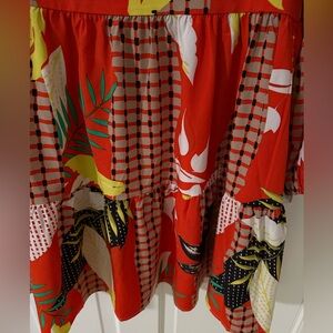 Vibrant dress with a mix of orange, yellow, and green patterns. Perfect for an autumn look with tights and boots. Has modest v-neck and lantern style sleeves. 2 tier gentle ruffle skirt. Very flattering and easy care. Size small-medium.