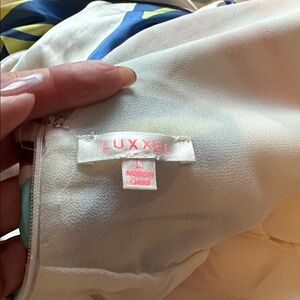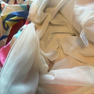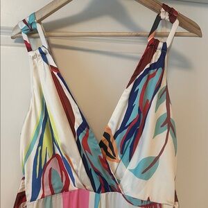Vibrant jumpsuit with a stunning multicolor pattern. Perfect for making a statement at any event. Sash to tie around waist. Zip in back, liner for a flattering not clingy fit. Sash to tie around waist. The colors are beautiful and the photos just don’t this piece justice.