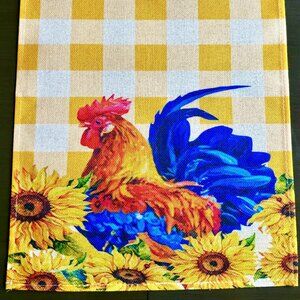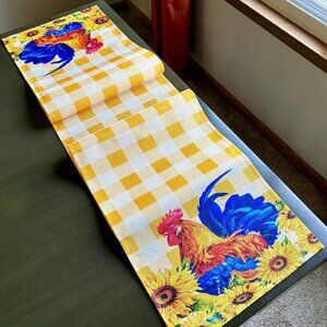 The design of this farmhouse-themed runner is so charming! It features a cheerful yellow buffalo check on the entire runner with a very detailed and colorful rooster and freshly-picked sunflowers on either end.