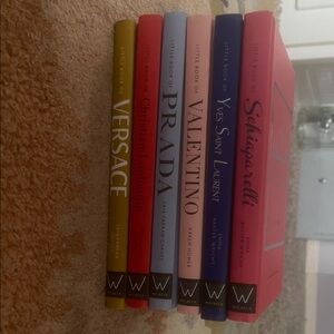 Set of six fashion books with vibrant covers. Includes shades of pink, blue, red, and gold. I just want them gone.