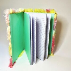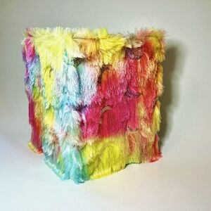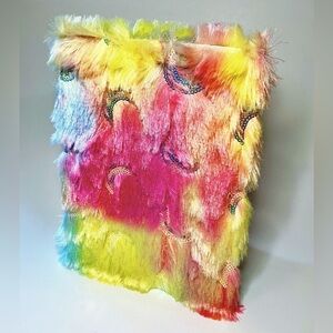 Vibrant faux fur notebook cover with rainbow colors and sequin crescent designs. Perfect for adding a fun touch to your stationery.