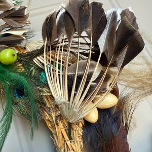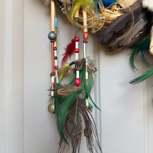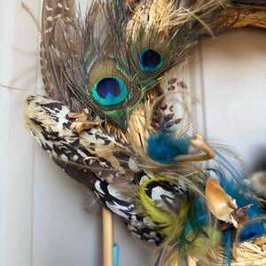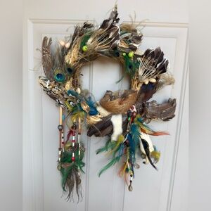 Vibrant wreath adorned with feathers and beads. Features shades of brown, green, blue, and red.