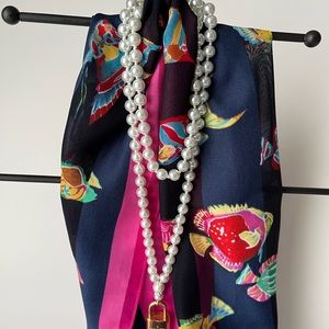 Super cute colorful scarf with fish design. Polyester. Vintage item.Excellent pre owned condition.