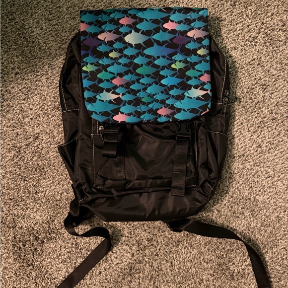 Stylish backpack with a colorful fish pattern flap. Perfect for everyday use.