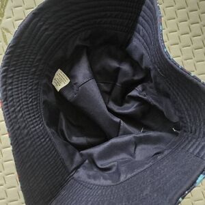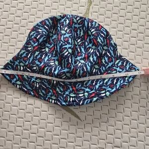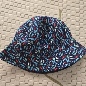 Vibrant bucket hat with a playful fish pattern. Features shades of blue, red, and green.