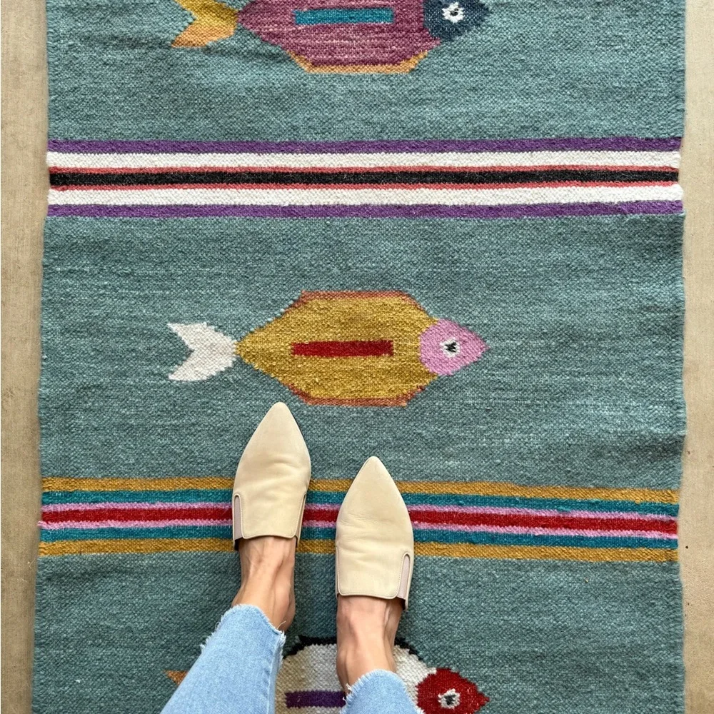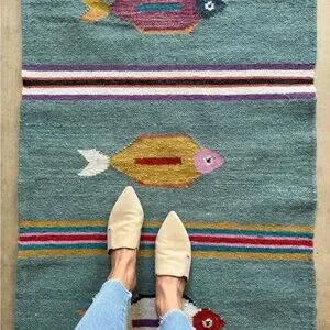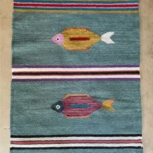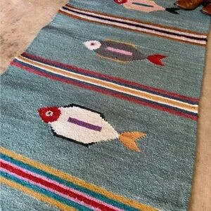 Brighten up your space with this colorful fish pattern rug. Perfect for fish enthusiasts, this rug features vibrant colors that add a playful touch to any room. This is a handmade, wool kilim woven rug.