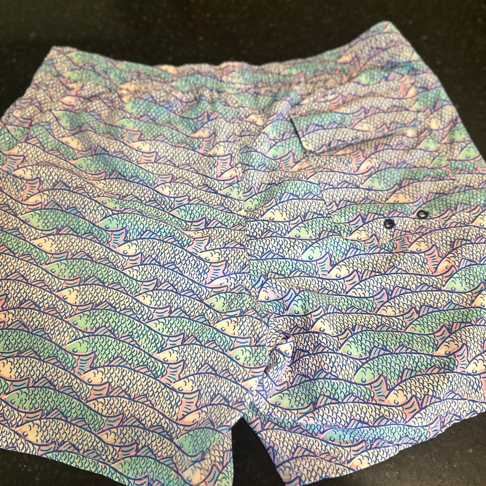 Vibrant shorts with a playful fish pattern. Features shades of blue, pink, and green.