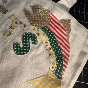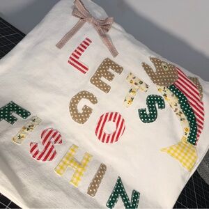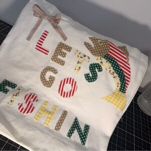 This is a cream canvas tote with colorful, patchwork lettering that spells “Let’s Go Fishin’”, made from the sweetest mix of florals, stripes, polka dots, and gingham. A playful little fish appliqué swims across the top, and a soft neutral bow adds the perfect girly touch.