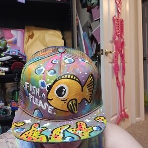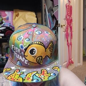 sealed, ready to wear. gentle wash only. Bright and playful fish-themed cap perfect for pet fish enthusiasts. Features vibrant colors and a fun design.