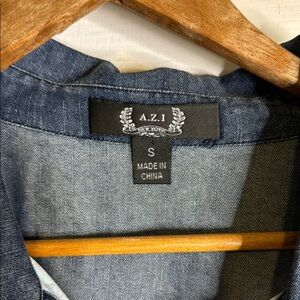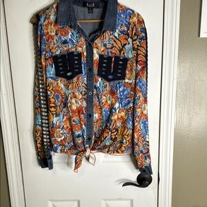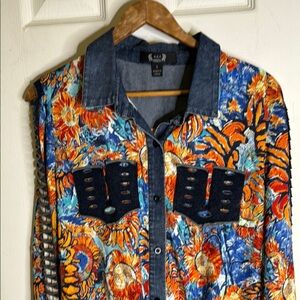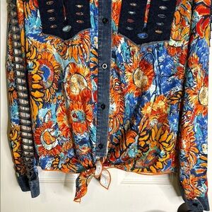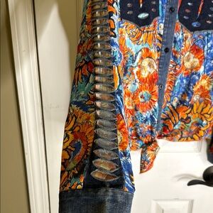 Colorful Floral Button Down Shirt Denim Trim Cutout Sleeves Size Small