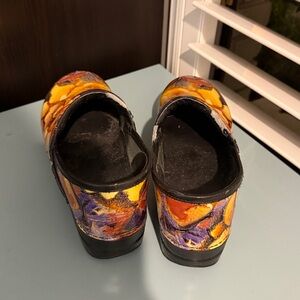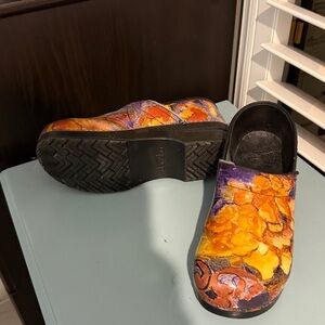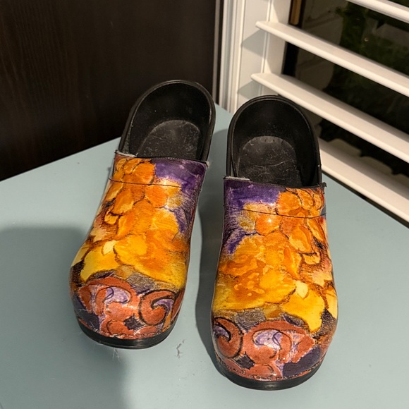 Vibrant clogs with a floral design in orange, yellow, and purple. Perfect for adding a pop of color to any outfit.