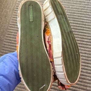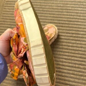 Chic platform sandals with a floral pattern. Features a mix of vibrant colors. Ideal for a stylish look.