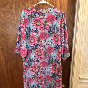Add a tropical twist to your wardrobe with this eye-catching floral kimono robe. Featuring a bright and colorful print with pops of pink, blue, and green on a soft white base, it delivers breezy movement and laid-back luxury. The open front, three-quarter sleeves, and flowy fit make it perfect for layering or lounging. Size: M Condition: NEW