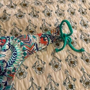 Vibrant bikini bottom with floral patterns and side ties for adjustable fit in blue, white, and pink colorway