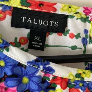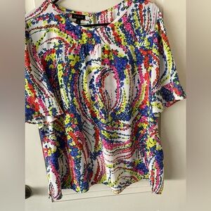 Vibrant blouse with a floral pattern. Features a mix of red, blue, yellow, and pink colors. Perfect for a bold look. Silky feel light top. Good for dress or casual. Pretty. Loop button back.