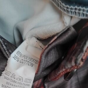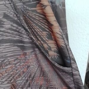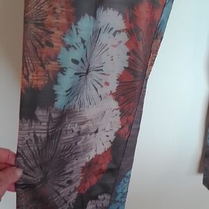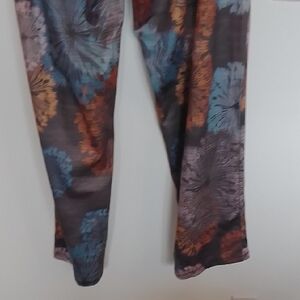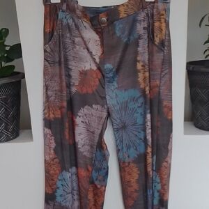 Vibrant pants with a floral pattern. Features shades of blue, orange, and brown.