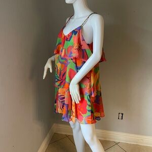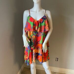 Vibrant dress with floral patterns and ruffle details. Features a mix of red, green, purple, and orange colors.