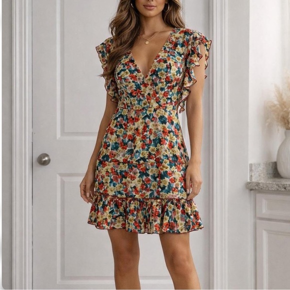 Charming dress with vibrant floral patterns and ruffle accents. Features a playful design with a flattering silhouette.