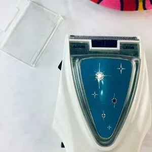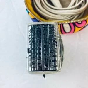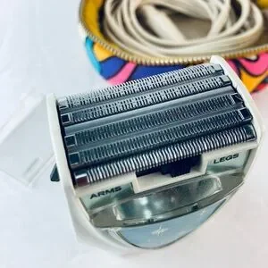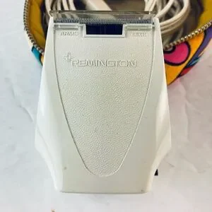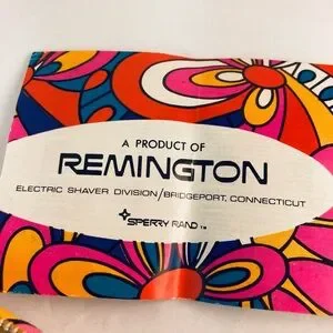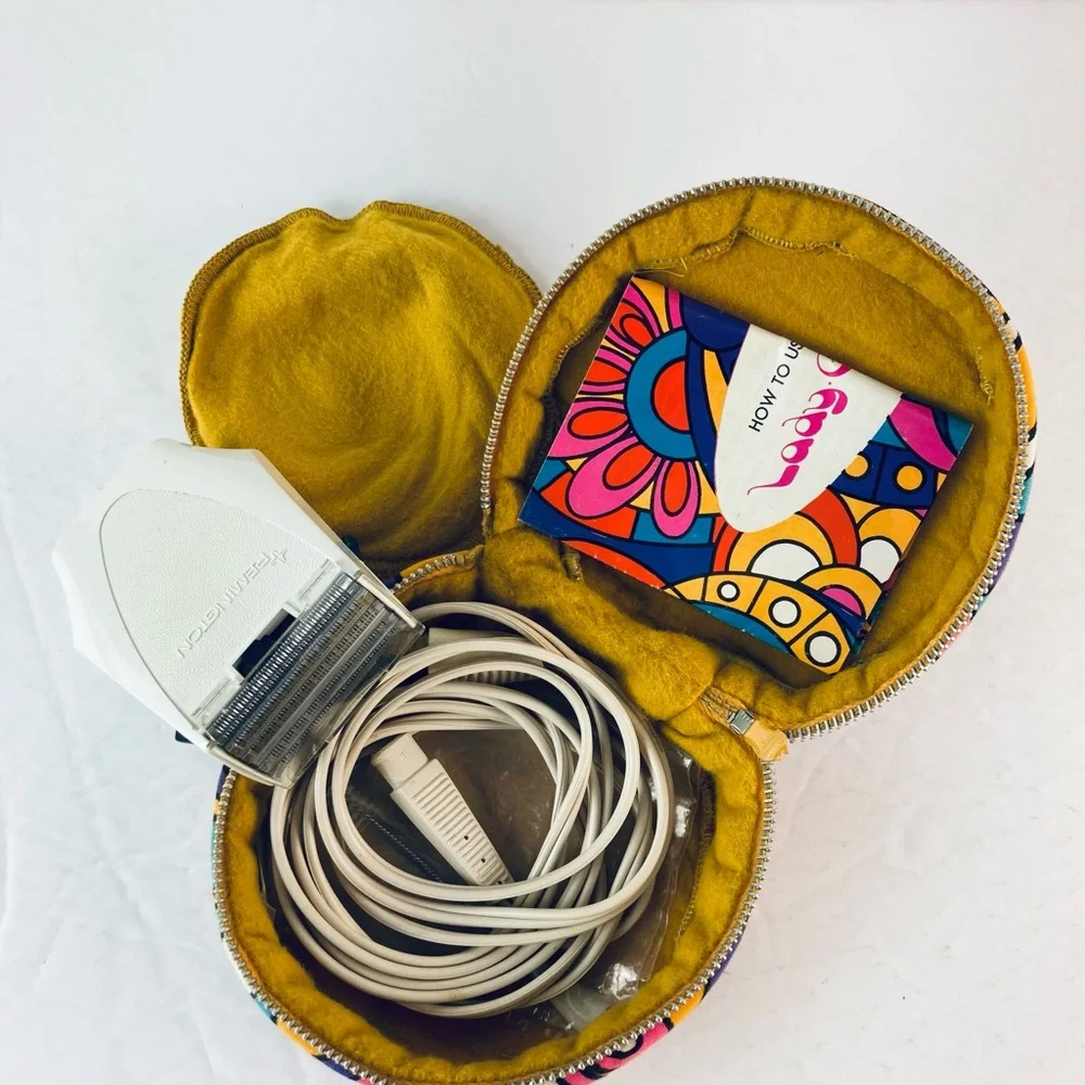 Remington 1967 Atomic Blue Lady Go Lightly Electric Razor. Vibrant floral tech accessory case with a yellow interior. Includes a blue and white electronic razor and cord, and original instructions. Please see all the pictures and ask questions if needed.