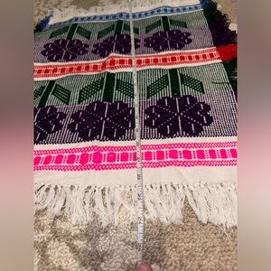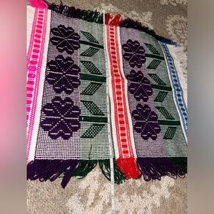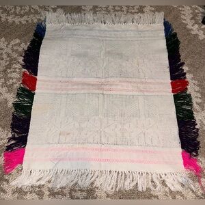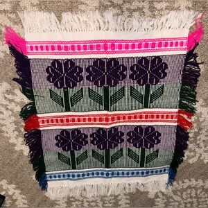 Brighten your space with this vibrant rug or placemat featuring bold floral patterns. showcases a mix of pink, purple, green, red, and blue hues, adding a lively touch to any room or a ethnic touch to the dining experience. Fringe along the edges.