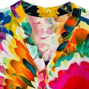Colorful Floral/Feather Print 3-Button Tunic Top - Sz M
