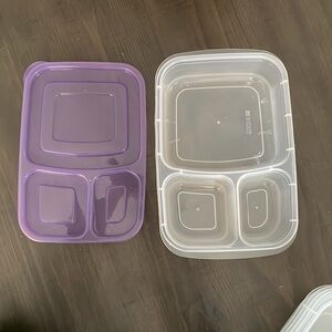 Set of colorful food storage containers with pink, orange, and red lids. Perfect for meal prep and organization.
