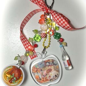Charming keychain featuring food-themed charms and a red gingham ribbon. Includes colorful beads and a mini bottle charm. However they wouldn’t be exactly like the photos being shown yet they’ll be a custom item and I’ll take recommendations.