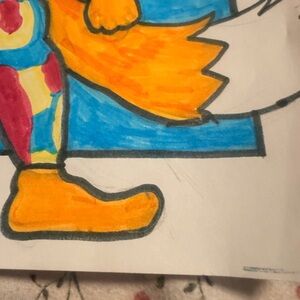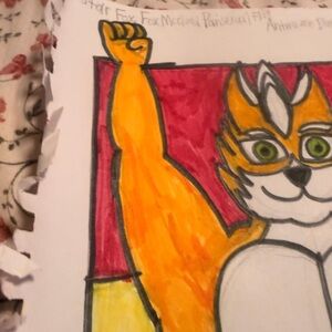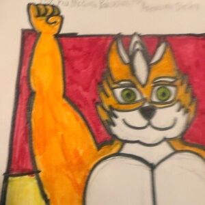 Vibrant drawing of a fox character with a muscular build. Features bright orange, yellow, red, and blue colors.