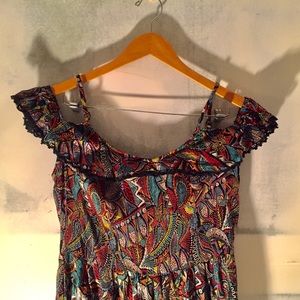 Colorful open-shoulder sundress by Angie for Free People. Vibrant patterned fabric that has a decorative crochet trim . There is a comfortable elastic waistband that makes sizing flexable. Size Small but will fit an medium too.