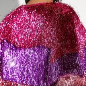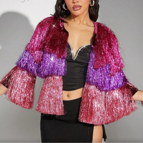 Haute Colorblock Metallic Fringe Open Coat. Vibrant jacket with red, purple, and pink fringe. Perfect for a bold statement.