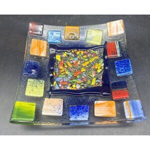 Colorful Fused Textured Art Glass Square Trinket Dish Ashtray 5.5” X 5.5”