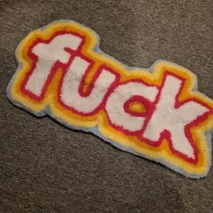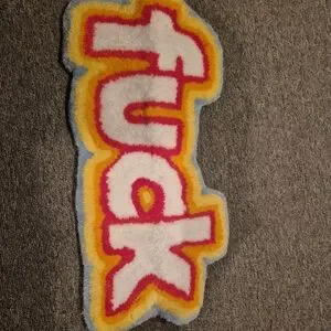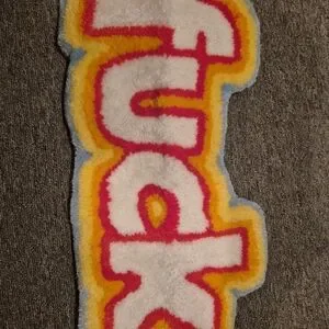 Vibrant rug with bold and snarky f*uck lettering. Features red, yellow, and blue accents. rug is 20" long and 10" high at the K and 8" at the U. Hard to find and rare!!