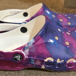 These vibrant clogs feature a stunning galaxy design in blue and purple. Perfect for playful adventures, they offer comfort and style. Brand new, never worn. Smoke-free home.