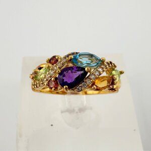 Elegant color palette of gemstones all in one beautiful ring. Like colorful flowers in a bouquet, there are oval, pear and round gems with small rows of diamonds swirling through.