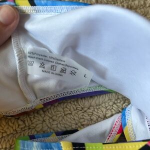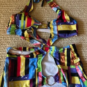 Vibrant bikini set with geometric patterns. Features a halter top and high-waisted bottoms. Perfect for a bold beach look.