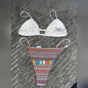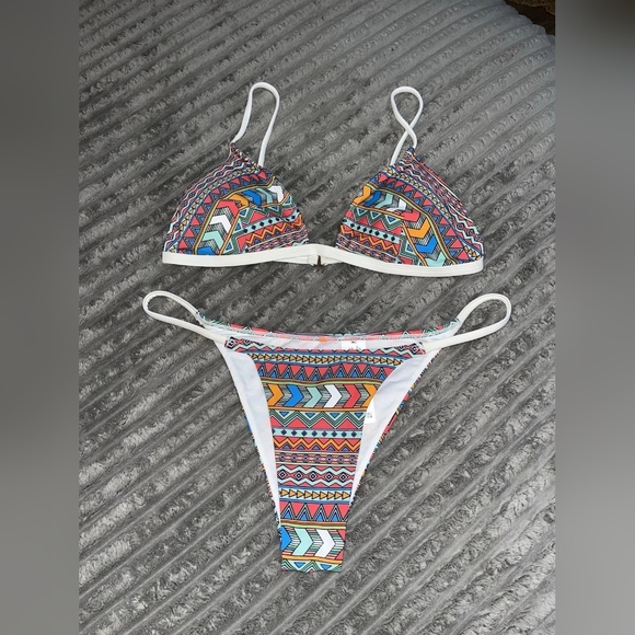 Vibrant bikini set with geometric patterns. Features a mix of colors including blue, orange, and pink.