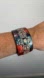 Bold cuff bracelet with geometric design. Features vibrant red and blue colors.