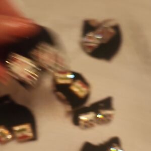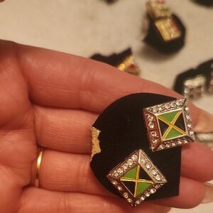 earrings with flag wSet of geometric earrings with vibrant colors. Features red, green, and gold accents. Perfect for adding a pop of color to any outfit.